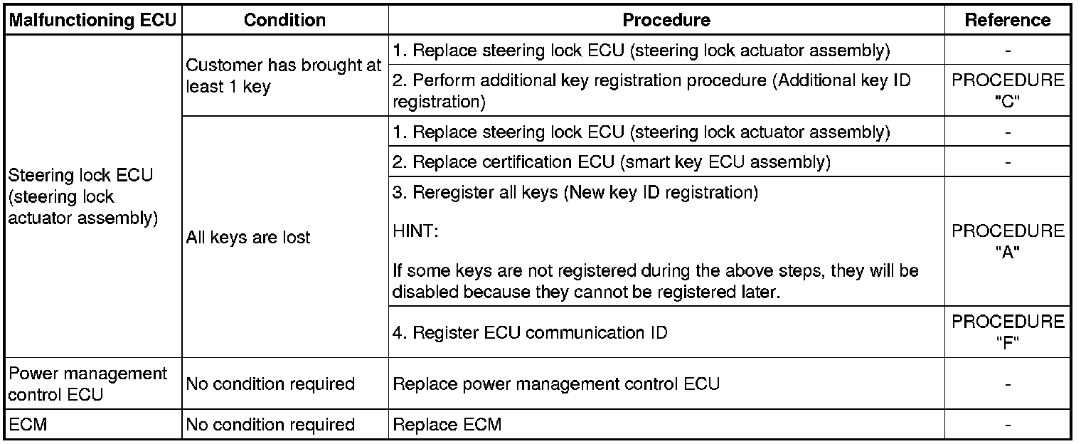 (a) The following table shows ECU replacement and key registration procedures for cases in which a malfunctioning ECU has been identified through the troubleshooting of the smart key system.