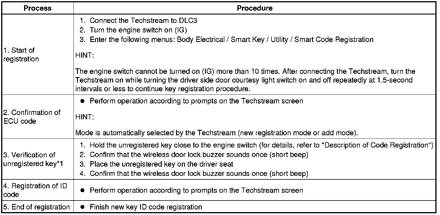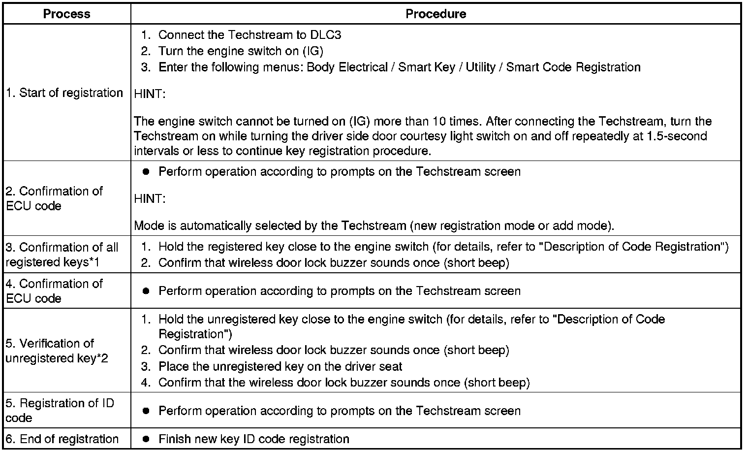 * *1: Perform this process for one of the keys registered for the vehicle. Finish the procedure within 30 seconds. If the procedure has not been finished within the specified time, perform the registration procedures again from process 1.