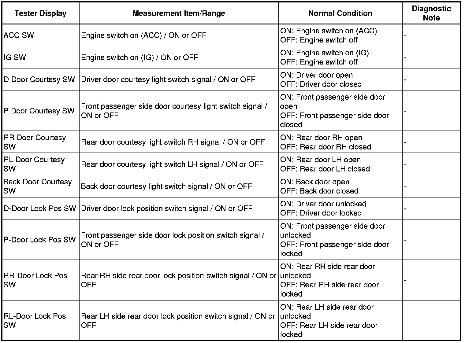 Using the Techstream to read the Data List allows the values or states of switches, sensors, actuators and other items to be read without removing any parts. This non-intrusive inspection can be very useful because intermittent conditions or signals may be discovered before parts or wiring is disturbed. Reading the Data List information early in troubleshooting is one way to save diagnostic time.