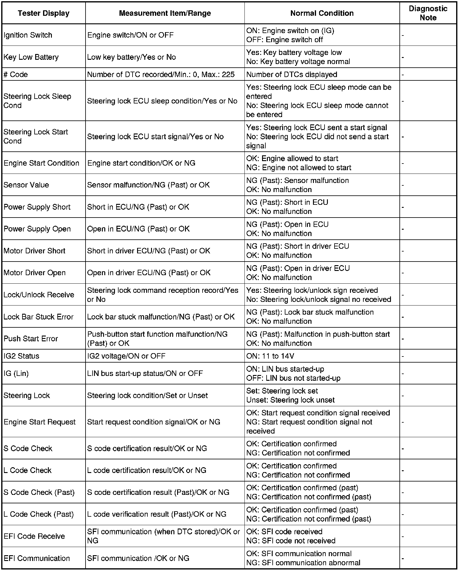 Using the Techstream to read the Data List allows the values or states of switches, sensors, actuators and other items to be read without removing any parts. This non-intrusive inspection can be very useful because intermittent conditions or signals may be discovered before parts or wiring is disturbed. Reading the Data List information early in troubleshooting is one way to save diagnostic time.