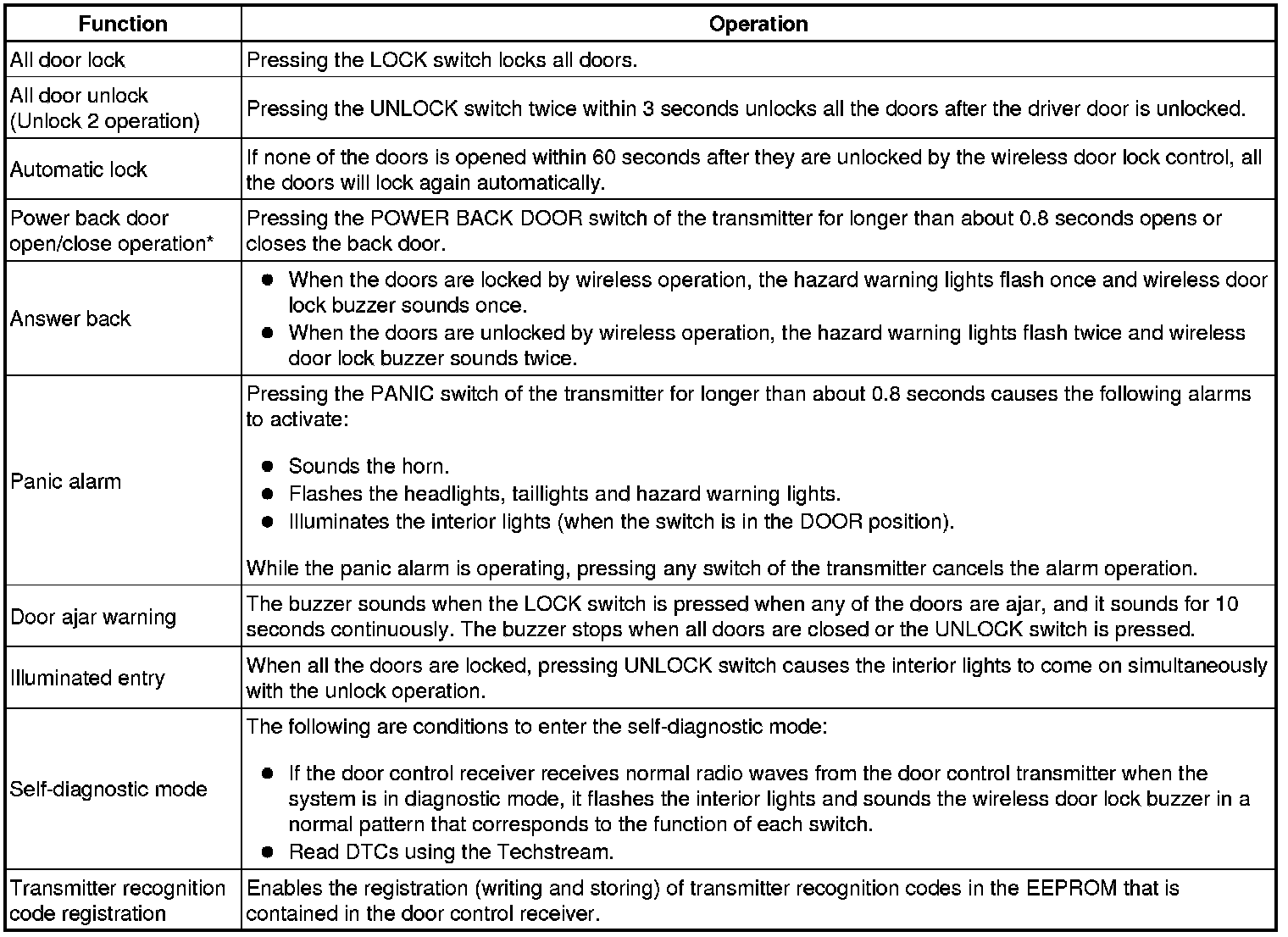 The wireless door lock control system functions to lock and unlock all the doors from a distance. The system is controlled by a door control transmitter which sends radio waves to the door control receiver. The main body ECU (driver side junction block assembly) performs an ID code identification process and engages the door lock.
