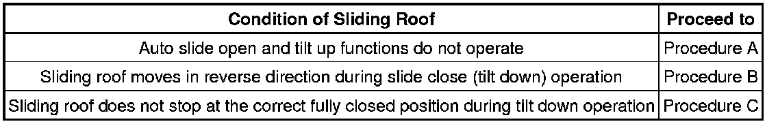 * When the sliding roof glass, sliding roof housing or sliding roof ECU (sliding roof drive gear sub-assembly) is replaced or removed and installed, the sliding roof drive gear requires initialization (pulse sensor initial position setting), as the glass position cannot be determined. If initialization is not performed, the auto slide open and tilt up functions and jam protection function may not operate, or the sliding roof may move in reverse or become misaligned.