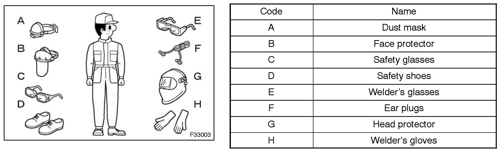 1. In addition to the usual mechanic's wear, cap and safety shoes, the appropriate gloves, head protector, welder's glasses, ear plugs, face protector, dust mask, etc. should be worn as the situation demands.