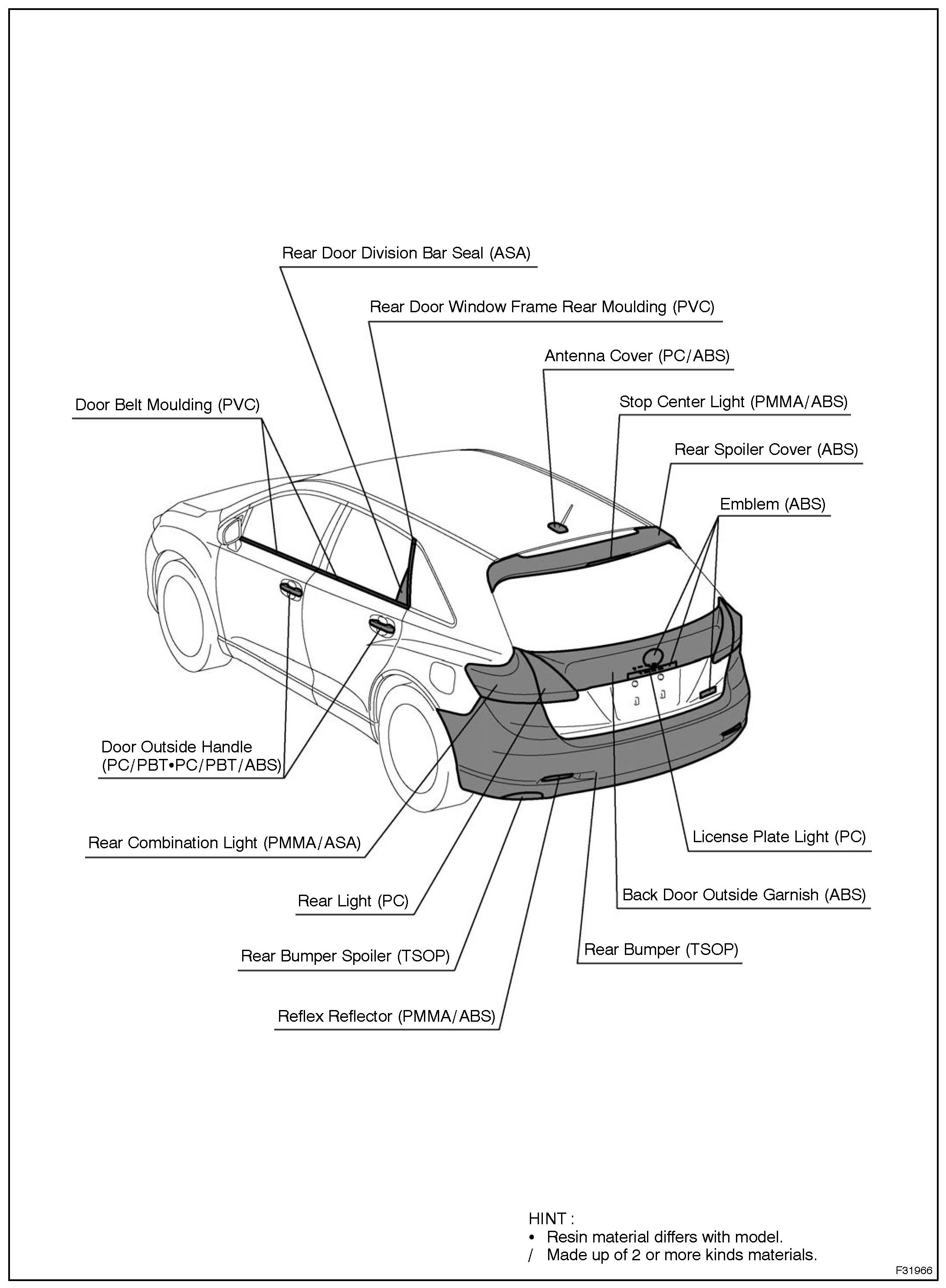 1. Rustproof high strength steel sheets are used for the body frame. Therefore, if these parts are heat repaired using an acetylene torch or equivalent, the crystalline structure changes, causing the strength of the steel sheets to decrease. Also, the zinc coating which is used to protect the body from rust will be damaged. This causes the surface of the steel sheets to become oxidized, which reduces their ability to resist rust.
