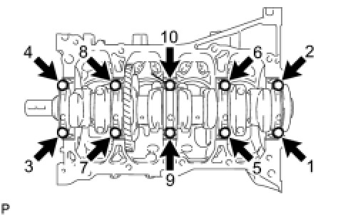 (a) Using several steps, uniformly loosen and remove the 10 bearing cap bolts in the sequence shown in the illustration.
