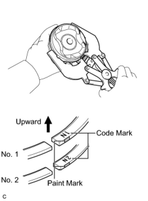 (b) Using a piston ring expander, install the 2 compression rings with the code mark positioned as shown in the illustration.