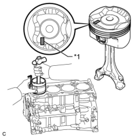 (d) Align the front marks of the piston and connecting rod, insert the connecting rod into the piston, and then push in the piston pin with your thumb until the pin comes into contact with the snap ring.