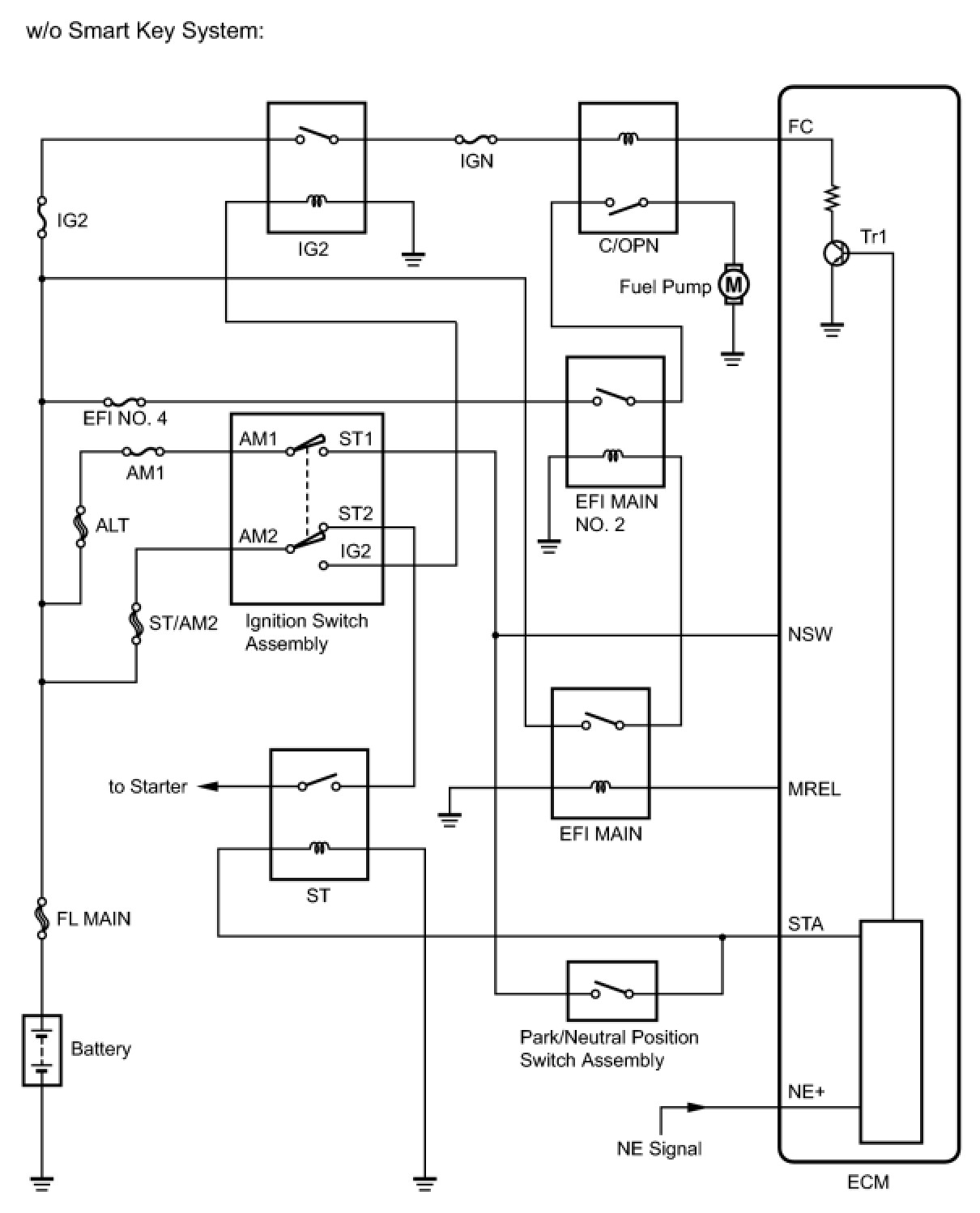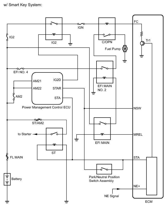 When the engine is cranked, the starter relay drive signal output from the STAR terminal of the power management control ECU is input into the STA terminal of the ECM, and the NE signal generated by the crankshaft position sensor is also input into the NE+ terminal. When the ECM interprets that the engine is cranked, it turns transistor Tr1 in the ECM internal circuit on. The current flows to the C/OPN (Circuit Opening) relay when Tr1 is turned on. Then, the fuel pump operates.