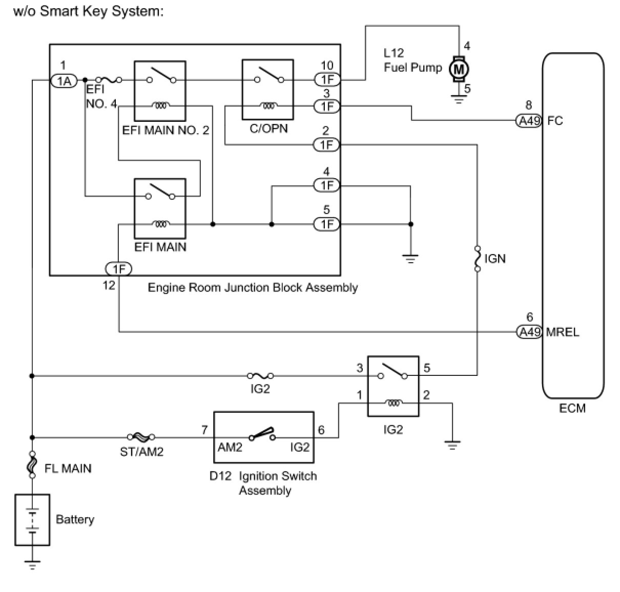 When the engine is cranked, the starter relay drive signal output from the ignition switch is input into the STA terminal of the ECM, and the NE signal generated by the crankshaft position sensor is also input into the NE+ terminal. When the ECM interprets that the engine is cranked, it turns transistor Tr1 in the ECM internal circuit on. The current flows to the C/OPN (Circuit Opening) relay when Tr1 is turned on. Then, the fuel pump operates.