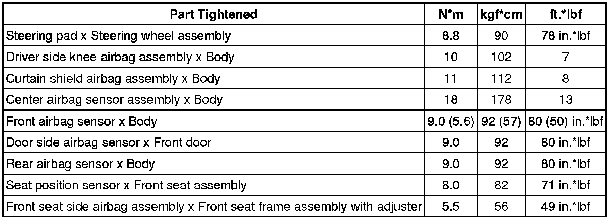 SPECIFICATIONS: SUPPLEMENTAL RESTRAINT SYSTEMS: TORQUE SPECIFICATIONS