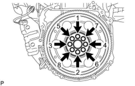 Install and uniformly tighten the 8 bolts in the sequence shown in the illustration.
