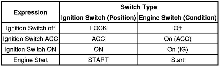 The type of ignition switch used on this model differs according to the specifications of the vehicle. The expressions listed in the table below are used in this section.
