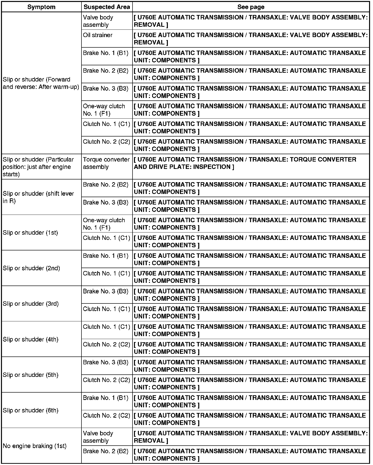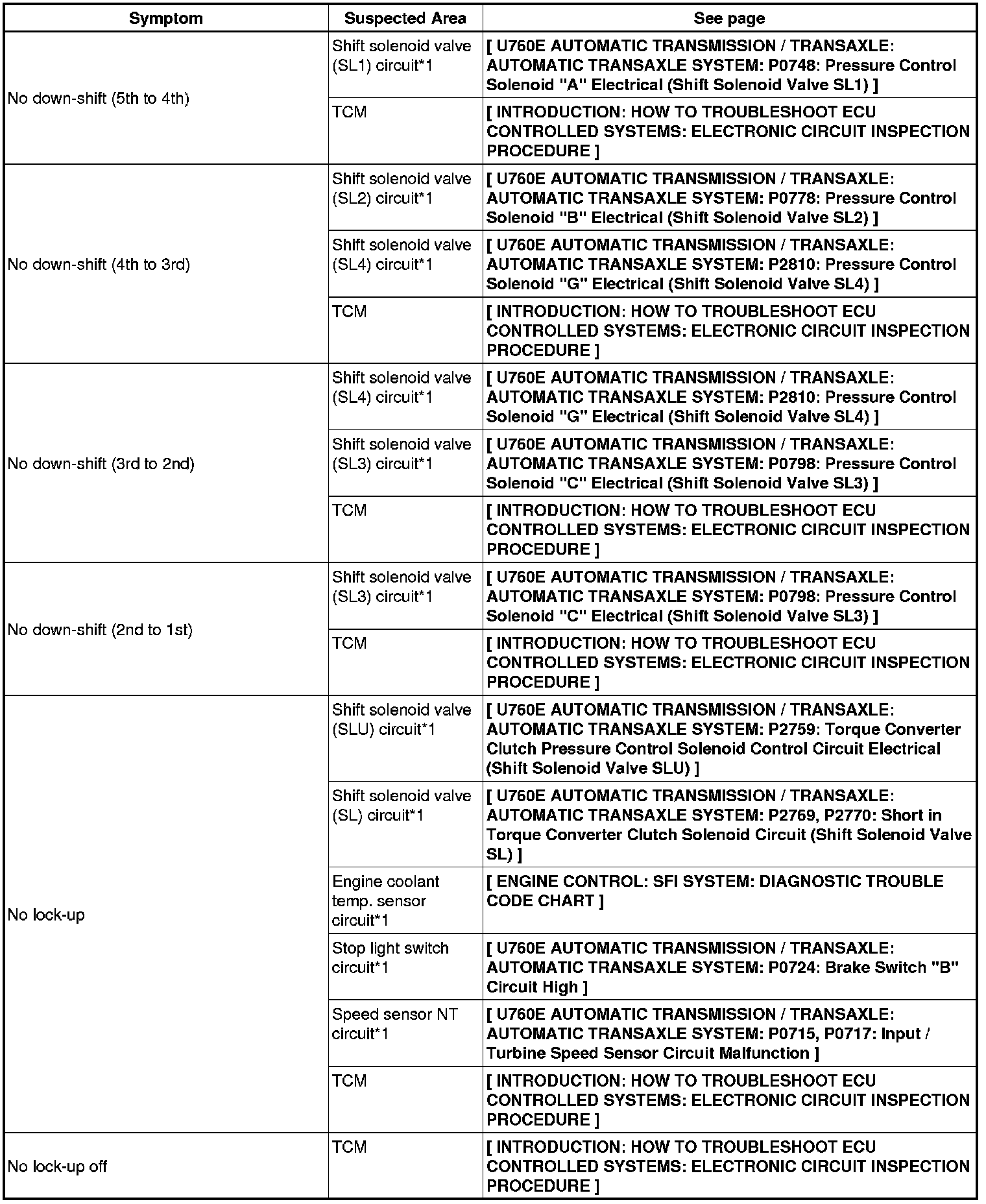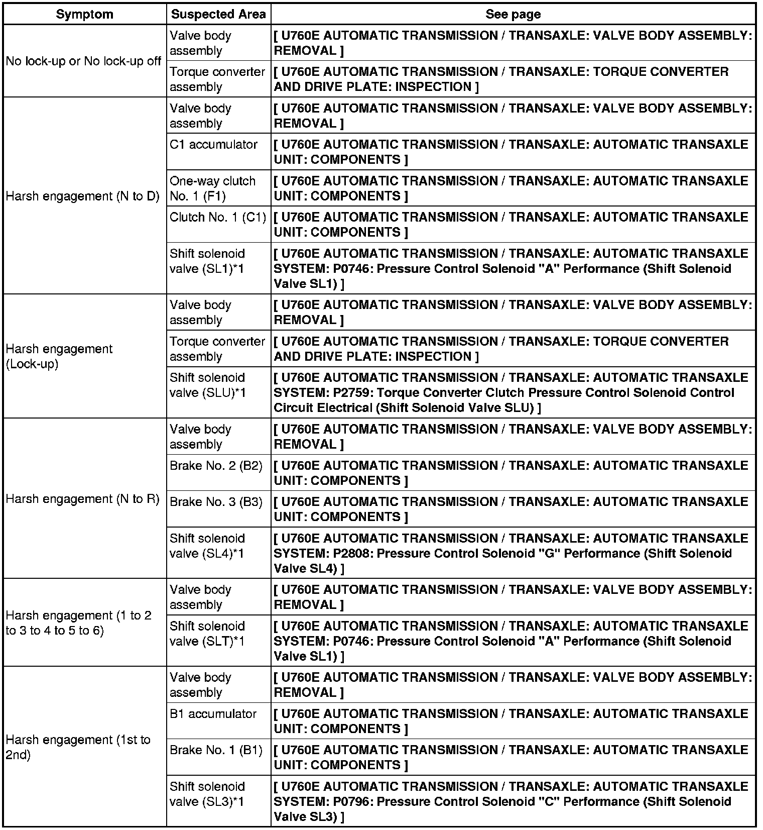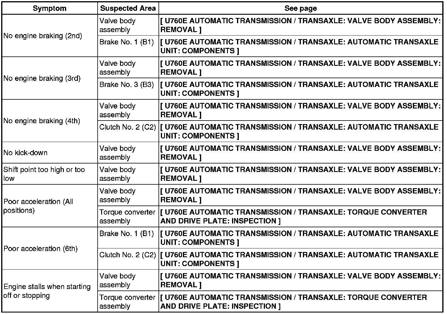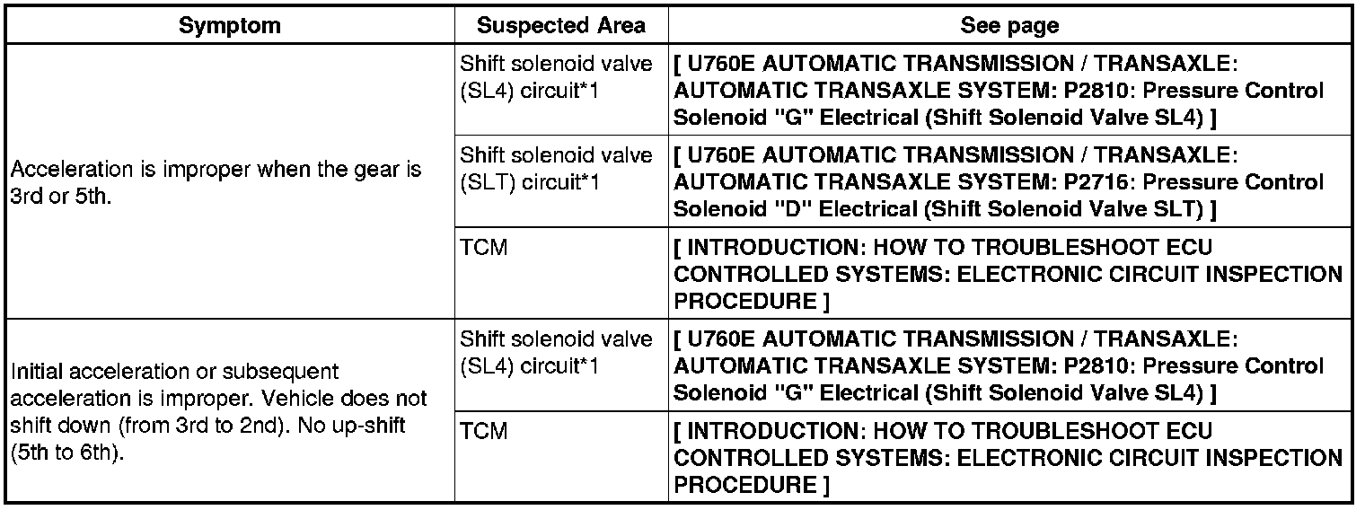 U760E AUTOMATIC TRANSMISSION / TRANSAXLE: AUTOMATIC TRANSAXLE SYSTEM: PROBLEM SYMPTOMS TABLE