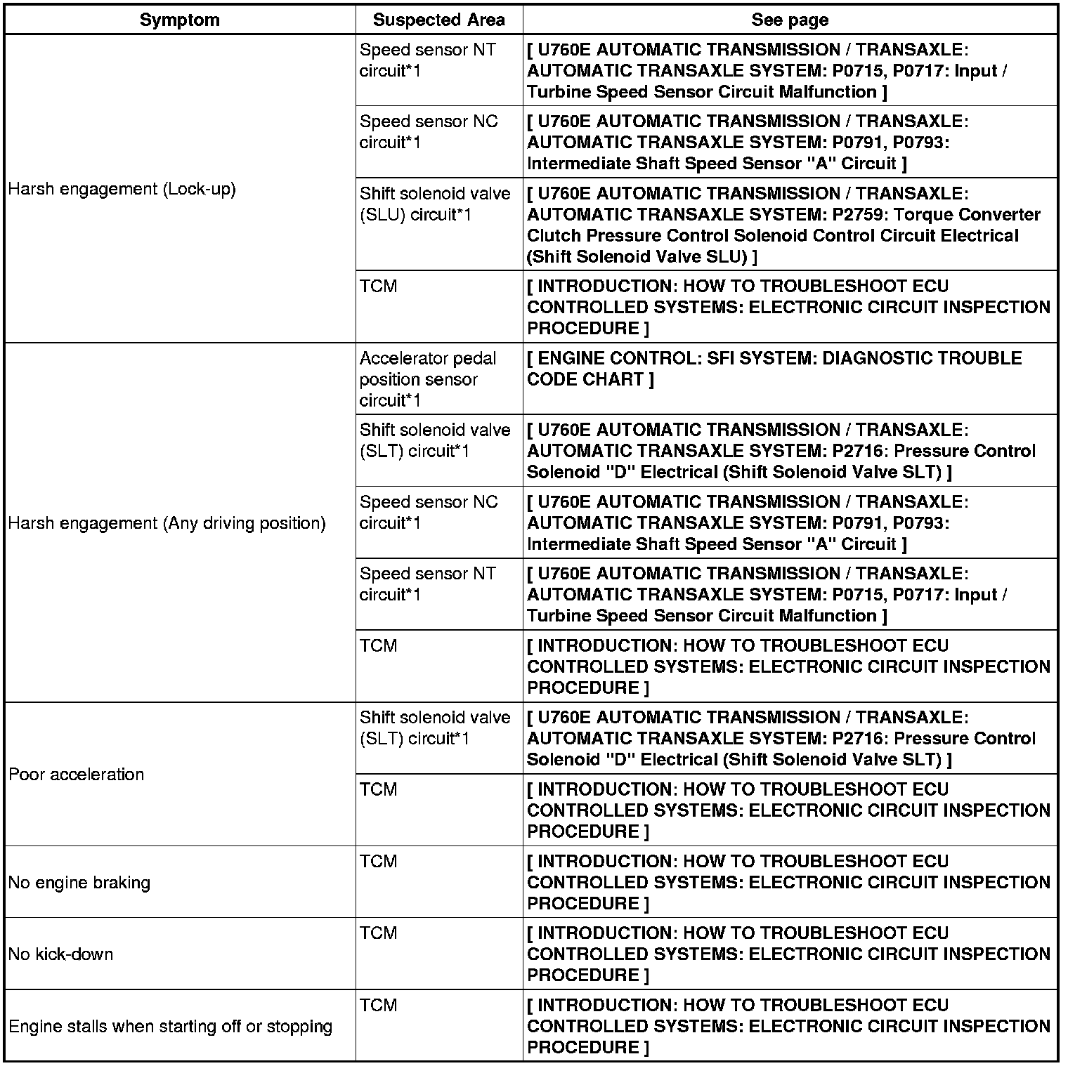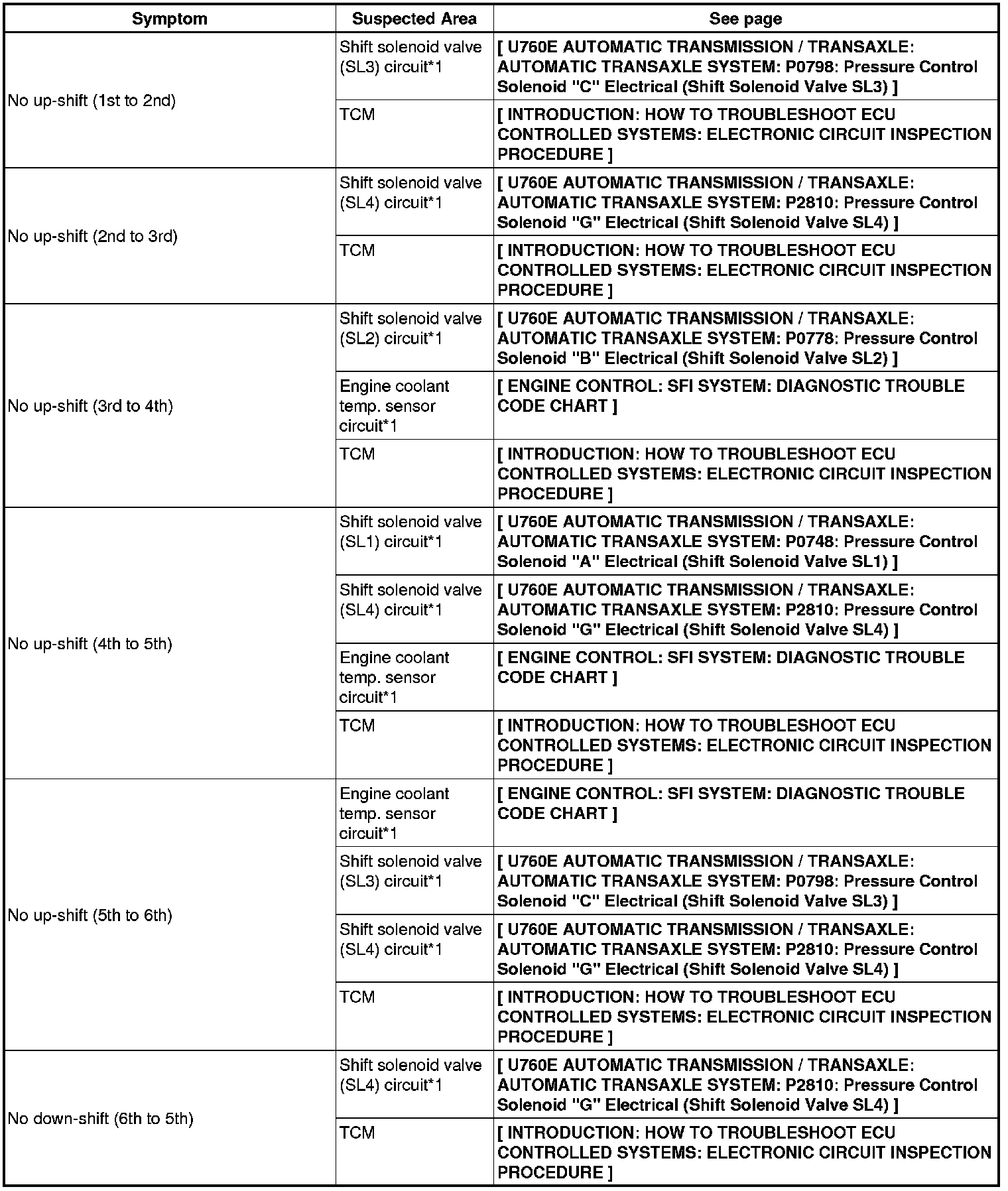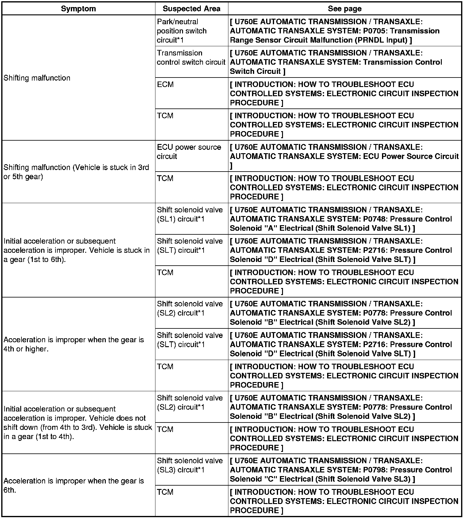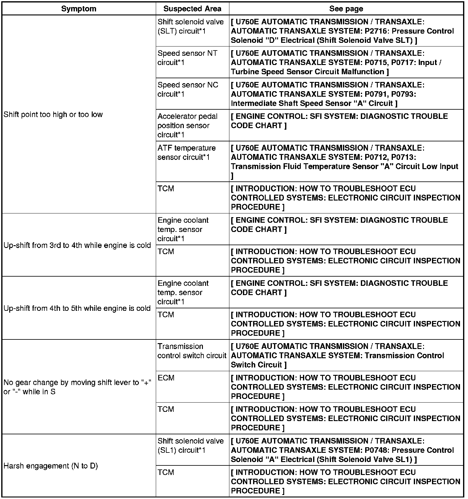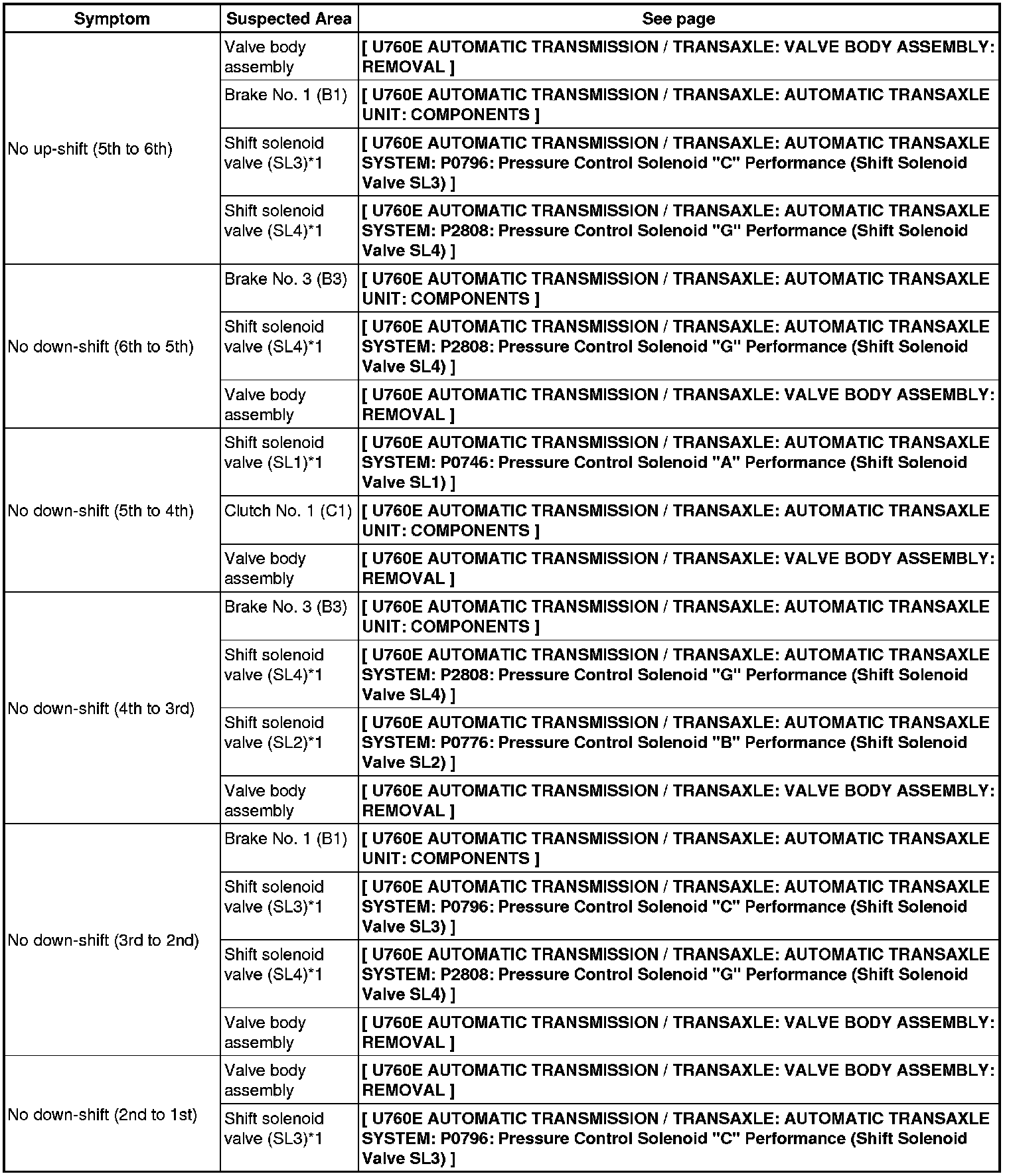 U760E AUTOMATIC TRANSMISSION / TRANSAXLE: AUTOMATIC TRANSAXLE SYSTEM: PROBLEM SYMPTOMS TABLE