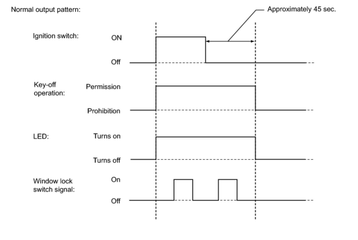During normal operation (fail-safe is not operating), or during fail-safe mode when there is a pulse sensor malfunction or the window position or learned value is abnormal, the LED illuminates as shown in the illustration.