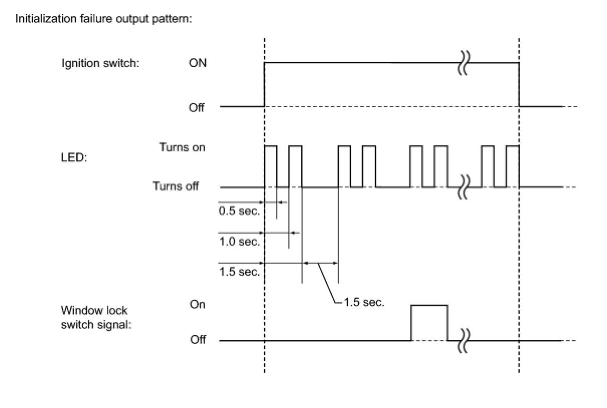During initialization of the power window regulator motor ECU, when the window position or initialization complete status cannot be properly read from the EEPROM during fail-safe mode, the LED illuminates as shown in the illustration.