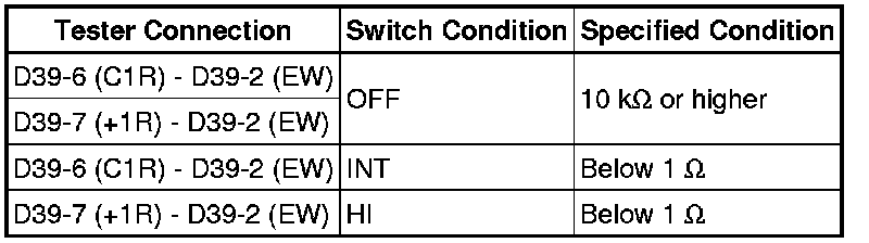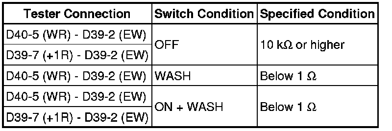 (5) Connect a battery negative (-) lead to terminal D40-1 (+S). Operate the intermittent wiper relay and check the voltage between terminals D40-3 (+1) and D39-2 (EW).