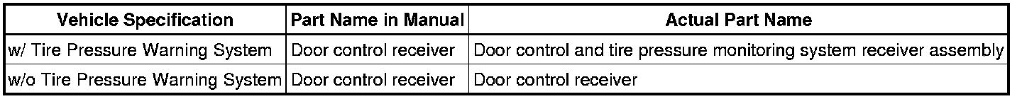 (a) The type of door control receiver used on this model differs according to the specifications of the vehicle. The expressions listed in the table below are used in this section.