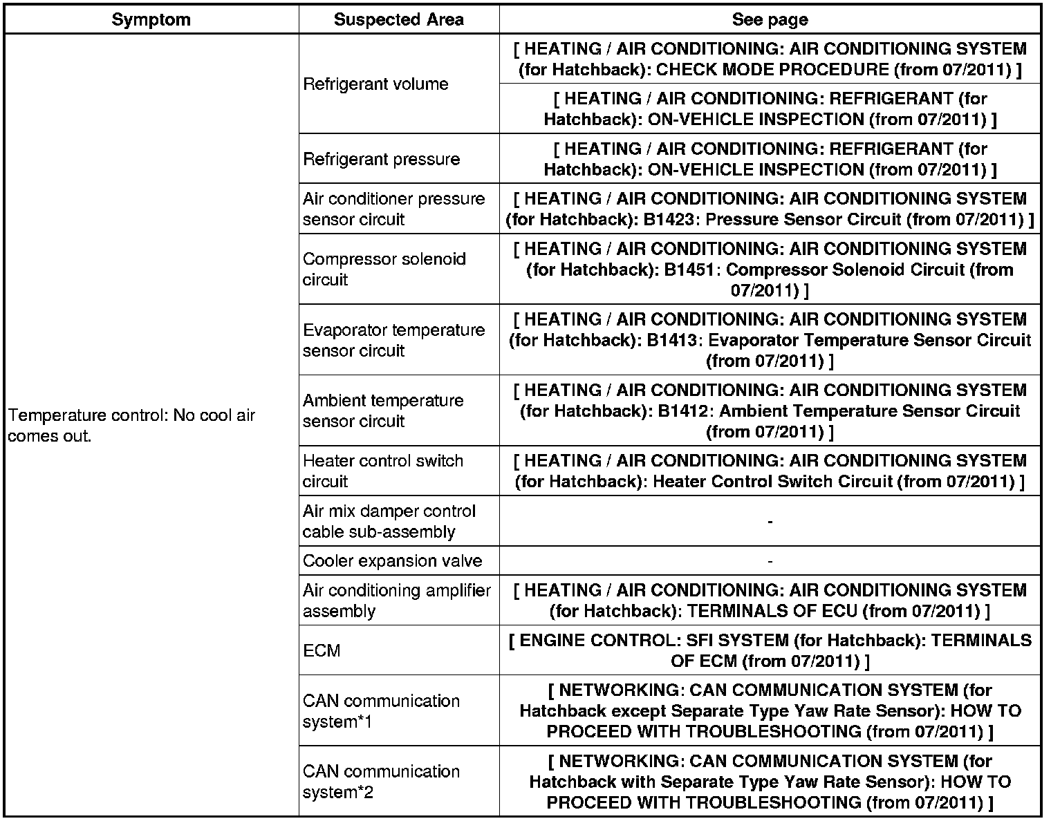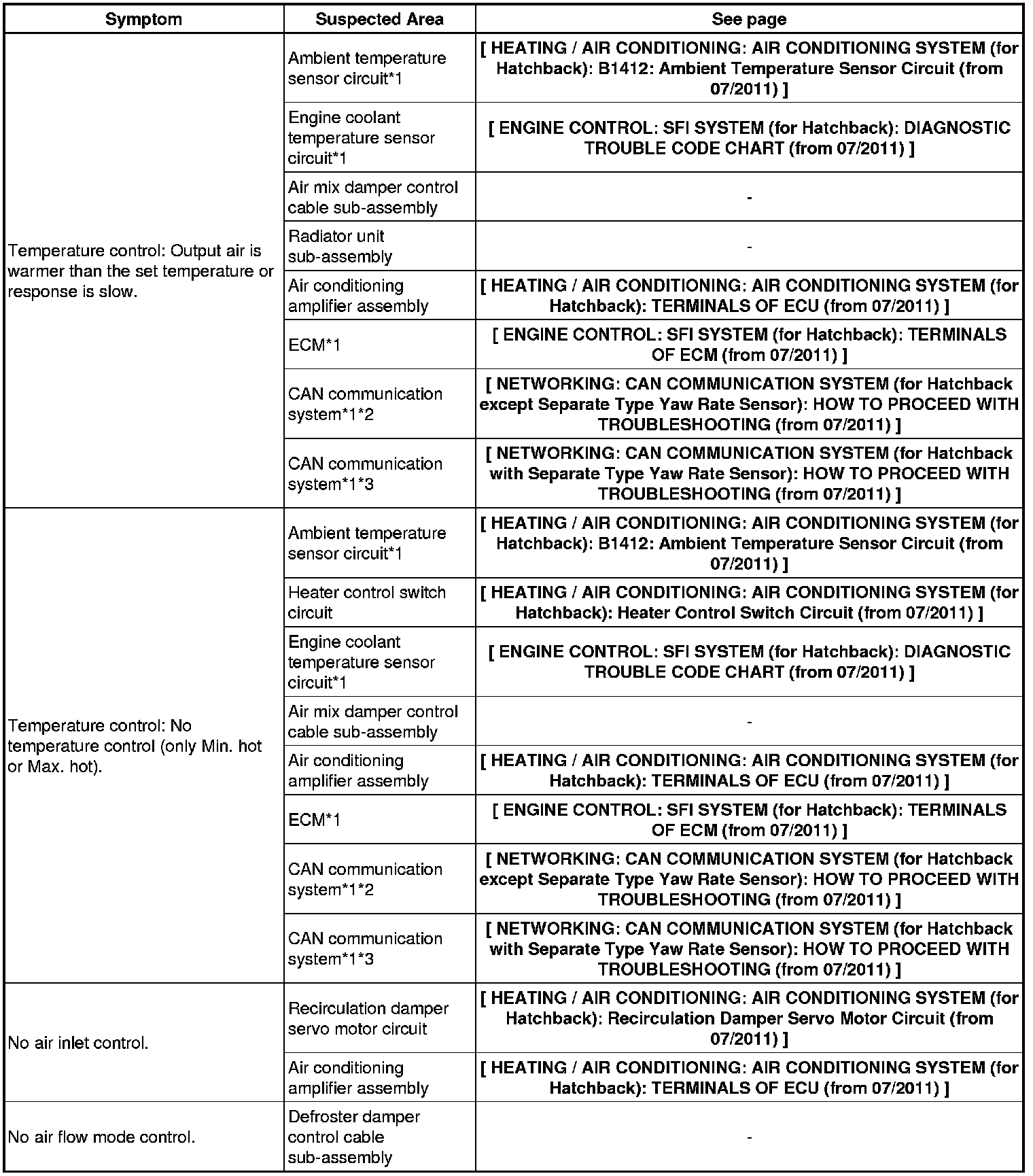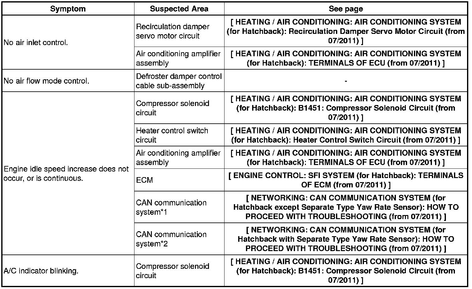 HEATING / AIR CONDITIONING: AIR CONDITIONING SYSTEM (for Hatchback): PROBLEM SYMPTOMS TABLE