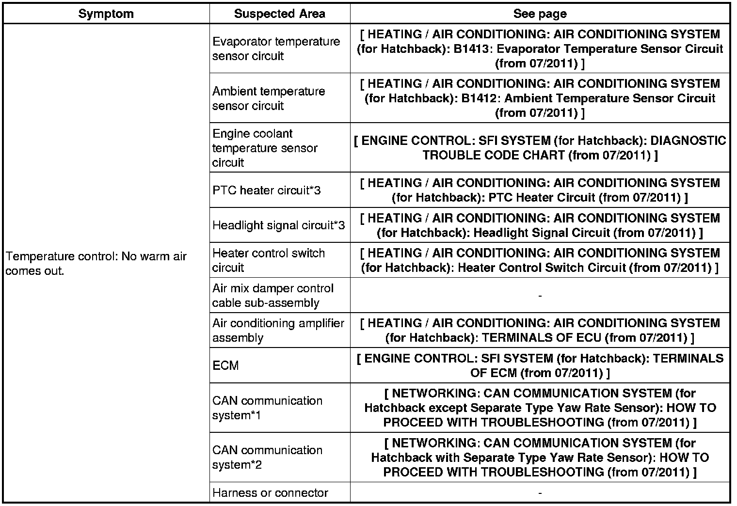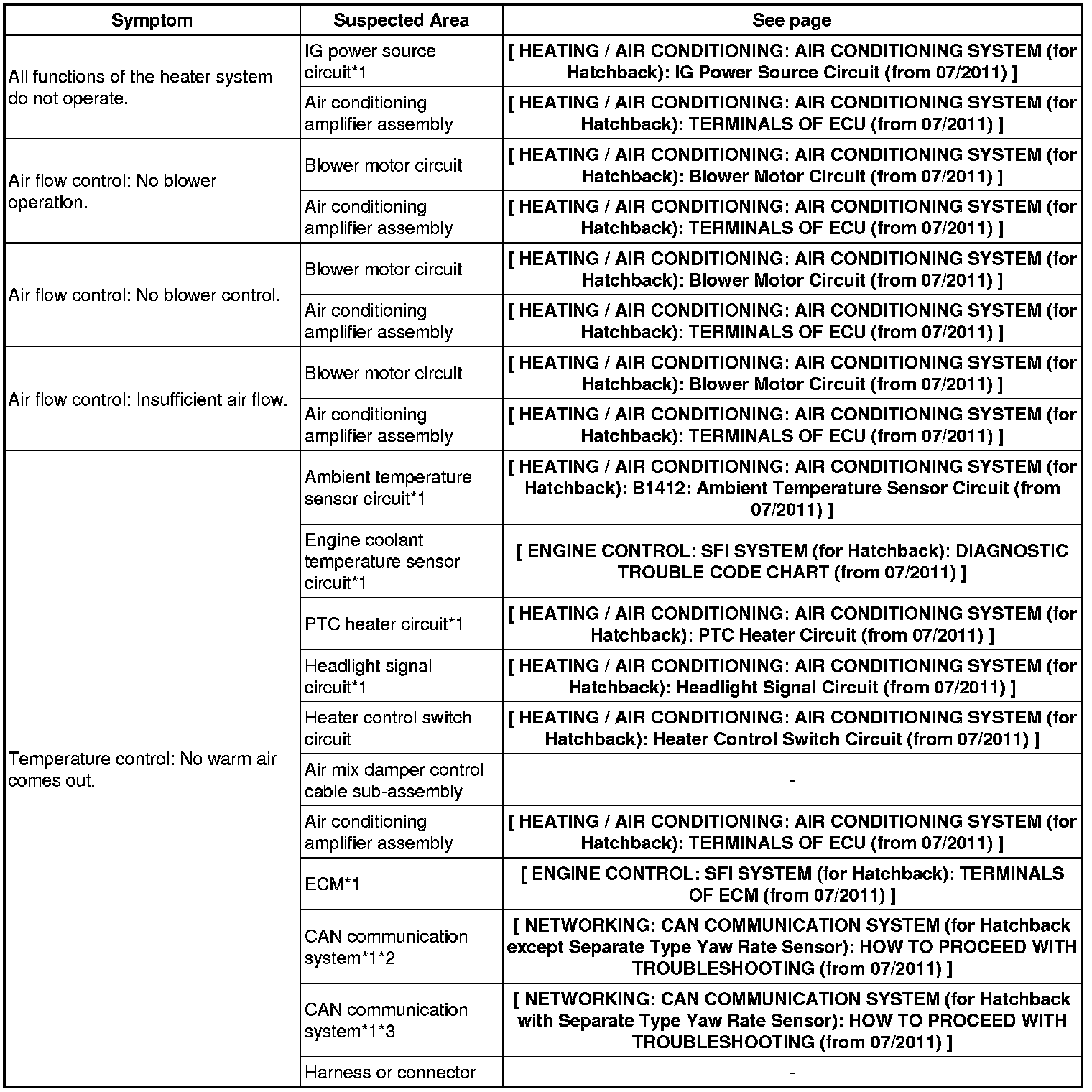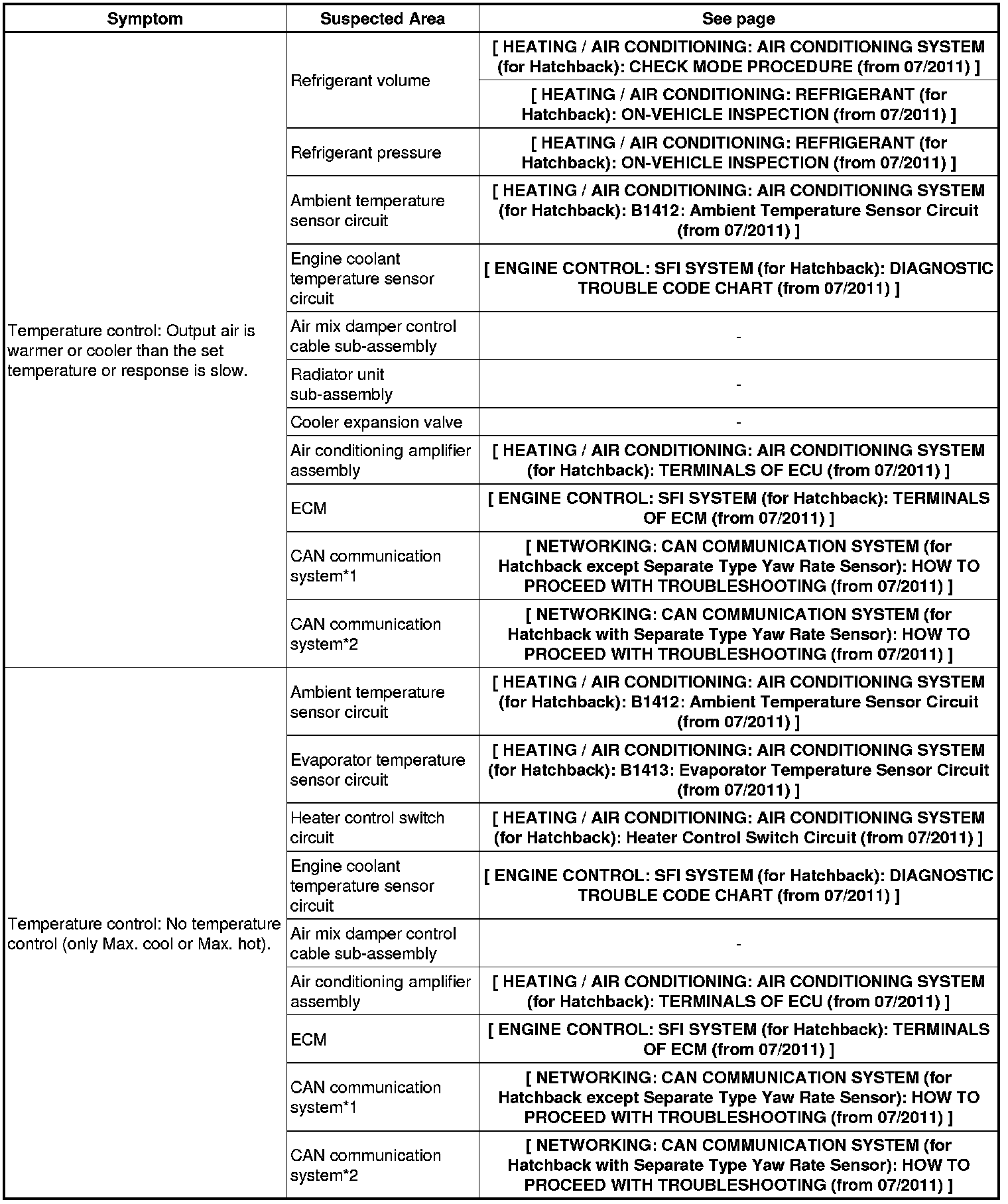 HEATING / AIR CONDITIONING: AIR CONDITIONING SYSTEM (for Hatchback): PROBLEM SYMPTOMS TABLE