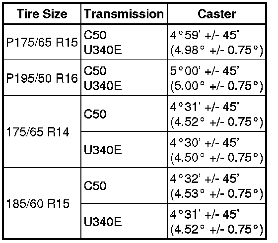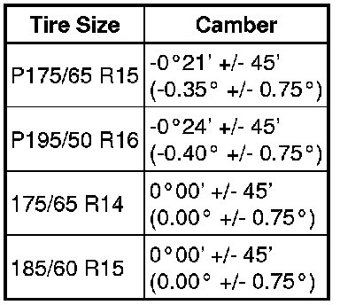 * The tolerance for the difference between the left and right wheels is 30' (0.5°) or less for both the camber and caster.