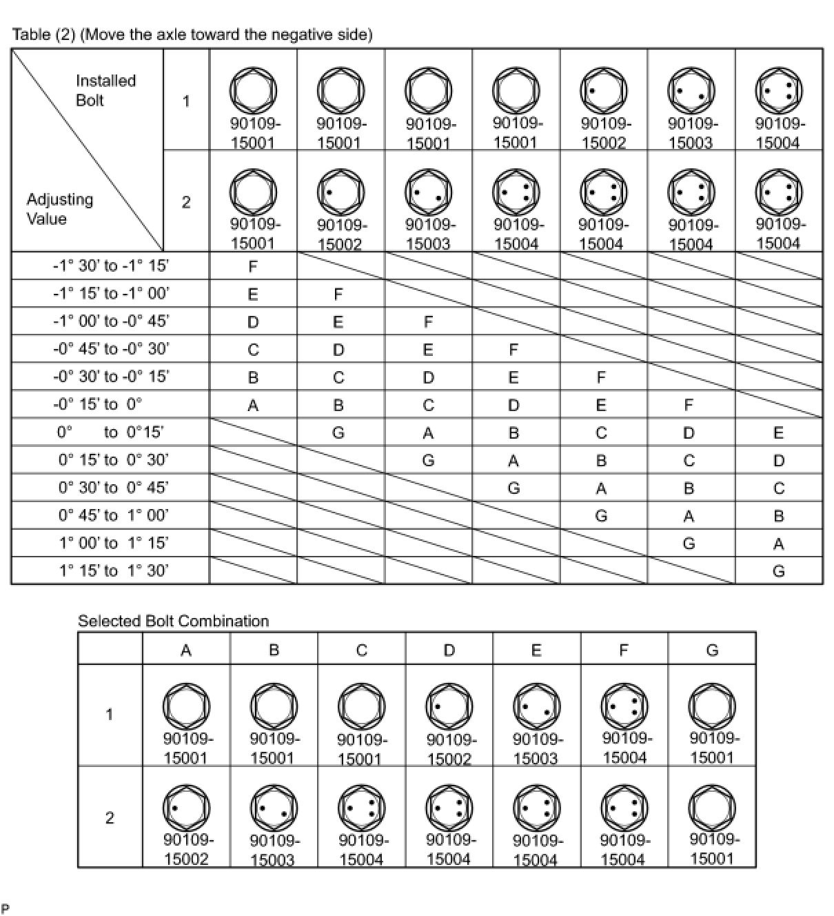 Check the combination of installed bolts. Select appropriate bolts from the table below to adjust the camber to within the specified range.