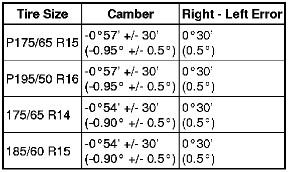 The tolerance for the difference between the left and right wheels is 30' (0.5°) or less for both cambers. If the camber is not within the specified range, inspect the suspension parts and replace them if necessary.