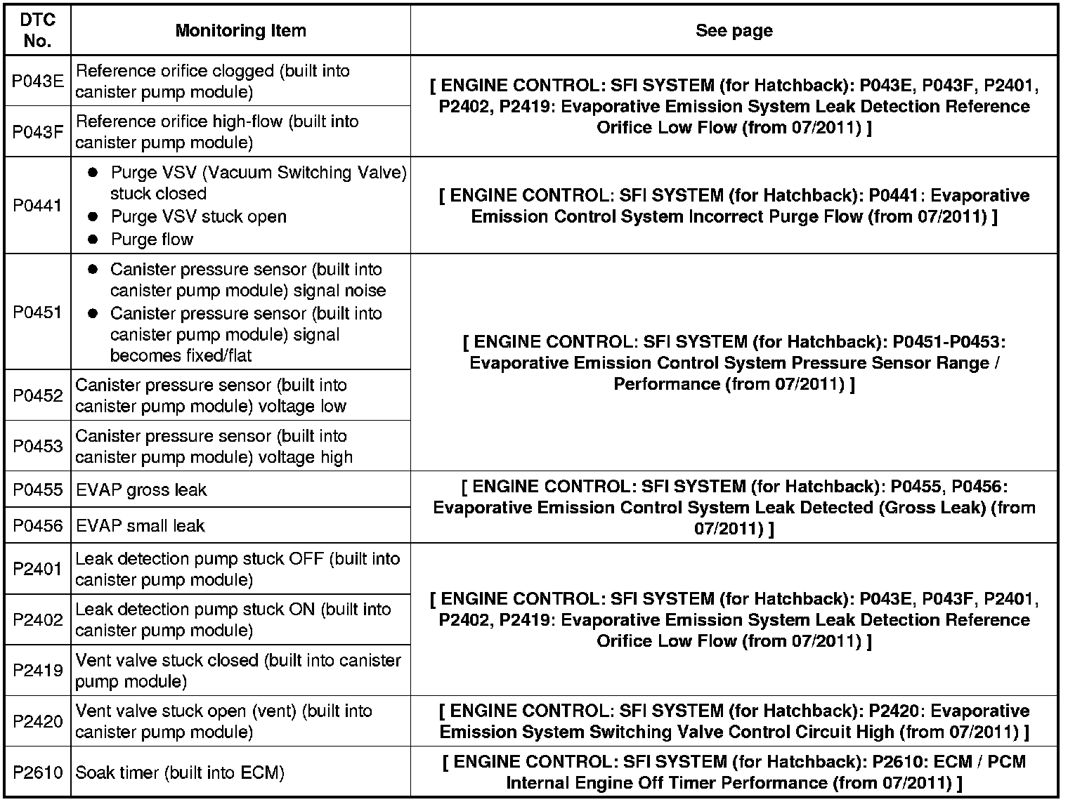 If the reference pressure difference between the first and second checks is more than the specification, all the DTCs relating to the reference pressure (P043E, P043F, P0441, P0455, P0456, P2401, P2420) will all be stored.