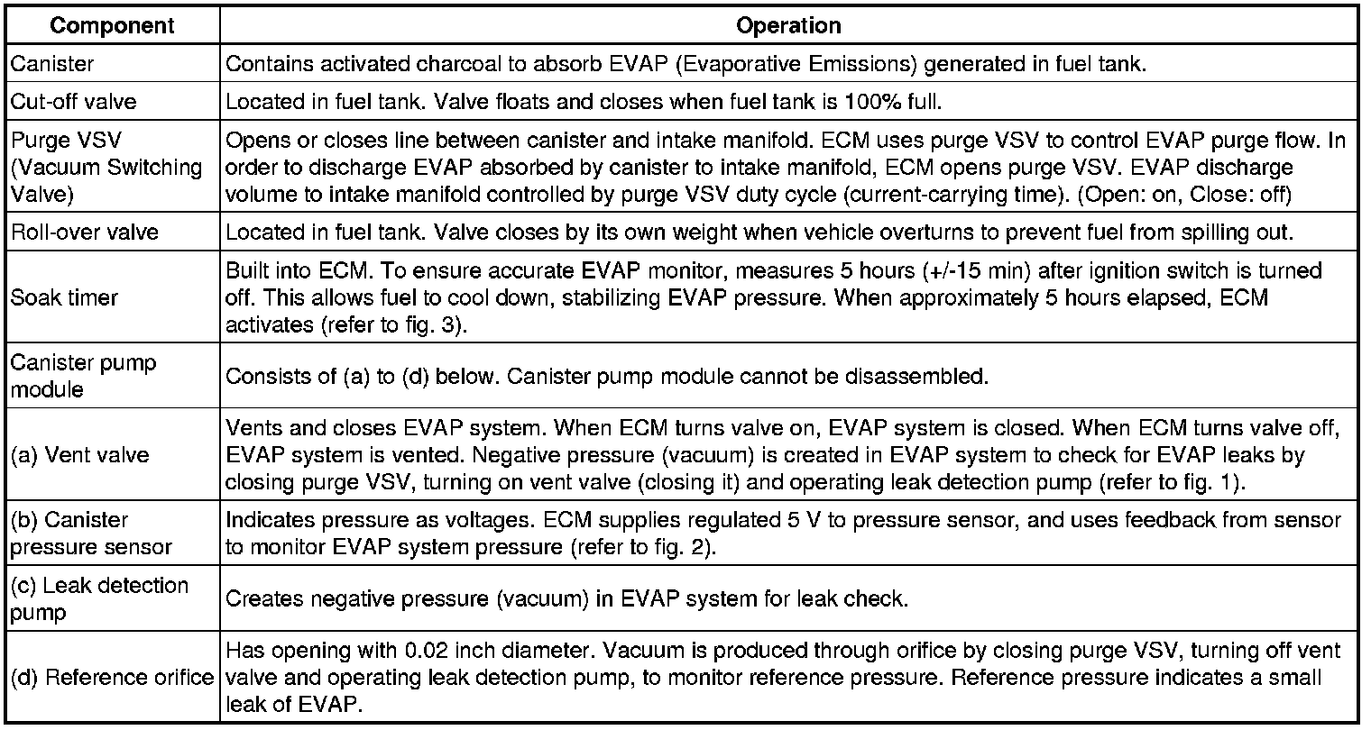 The leak detection pump creates negative pressure (vacuum) in the EVAP system and the pressure is measured. Finally, the ECM monitors for leaks from the EVAP system, and malfunctions in both the canister pump module and purge VSV based on the EVAP pressure.