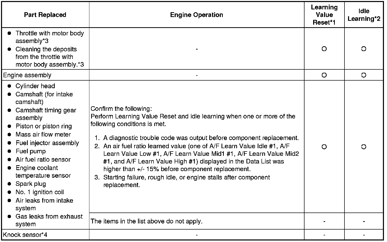 Perform Learning Value Reset and idle learning after replacing or servicing parts related to engine operation. Details on procedures required are indicated by an asterisk and a number, and are explained in detail following the table.