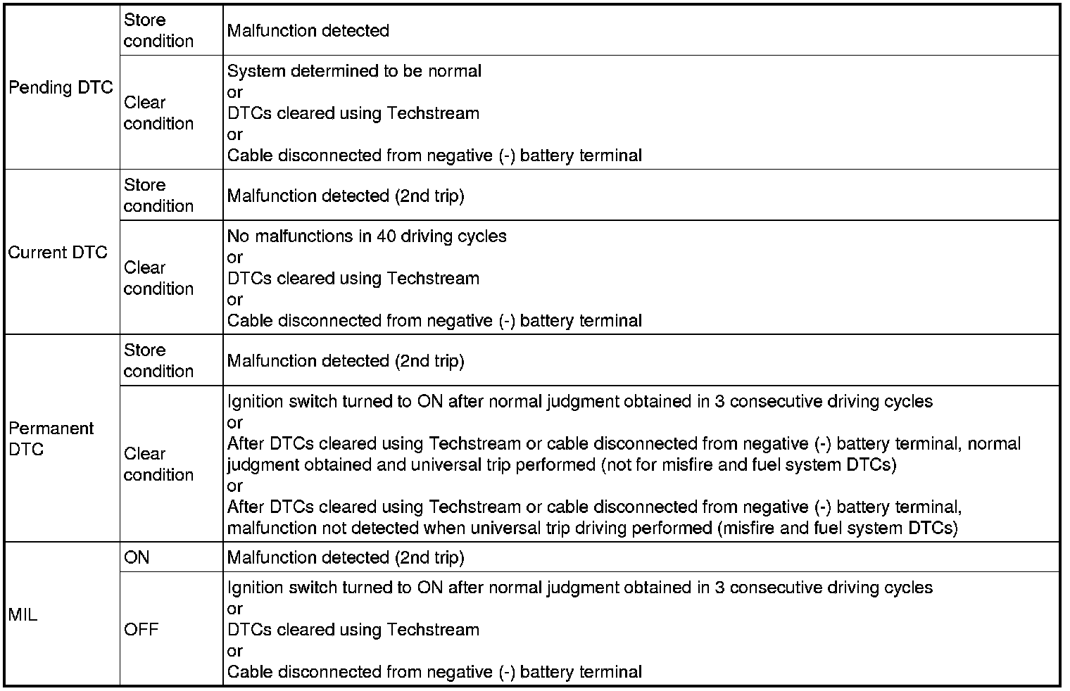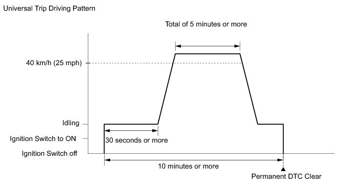 * After clearing current DTCs using the Techstream (or by disconnecting the cable from the negative battery terminal), permanent DTCs can be cleared when the system is determined to be normal for the relevant DTCs and then the universal trip is performed. The driving pattern to obtain a normal judgment is described under the "Confirmation Driving Pattern" for the respective DTC.