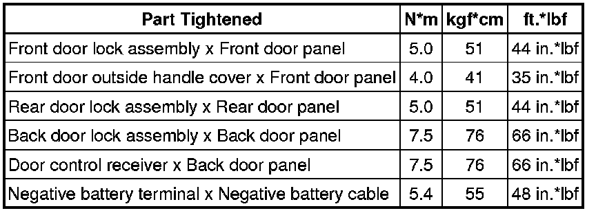SPECIFICATIONS: DOOR LOCK (for Hatchback): TORQUE SPECIFICATIONS