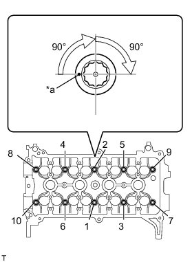 Retighten the cylinder head bolts an additional 90°, and then once more 90° as shown in the illustration.