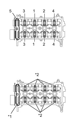 Uniformly tighten the bolts in several steps in the sequence shown in the illustration and install No. 1 camshaft bearing cap and No. 2 camshaft bearing cap.