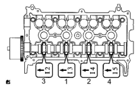 Examine the front marks and numbers on the No. 1 and No. 2 camshaft bearing caps and check that the order is as shown in the illustration. Then uniformly tighten the bolts, in several steps, in the sequence shown in the illustration.