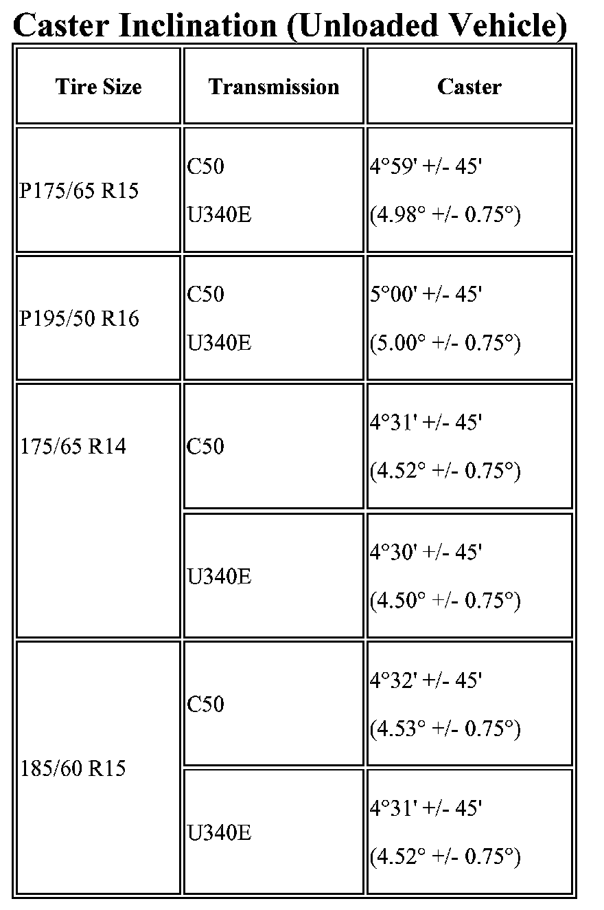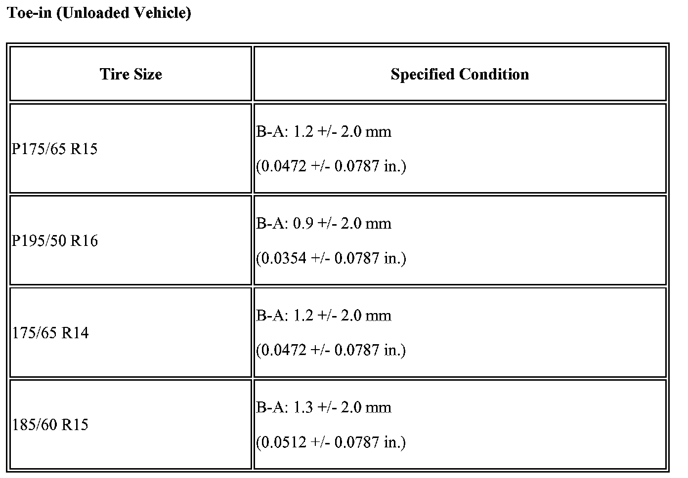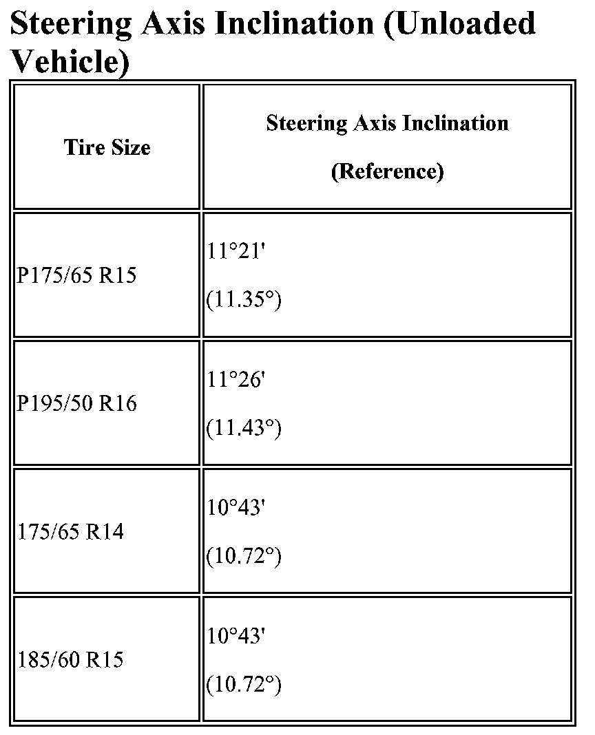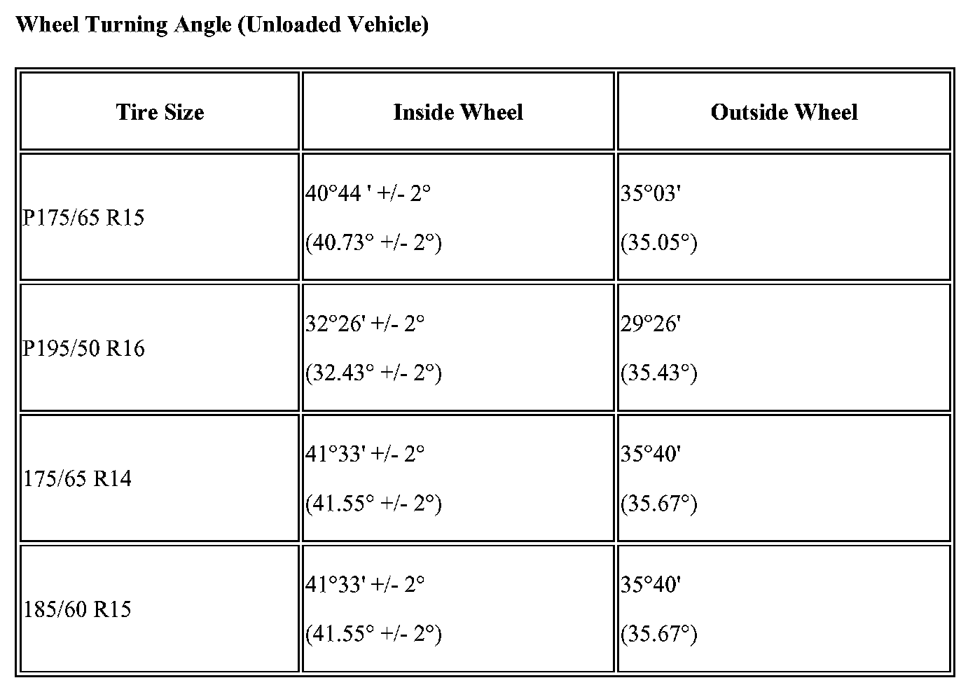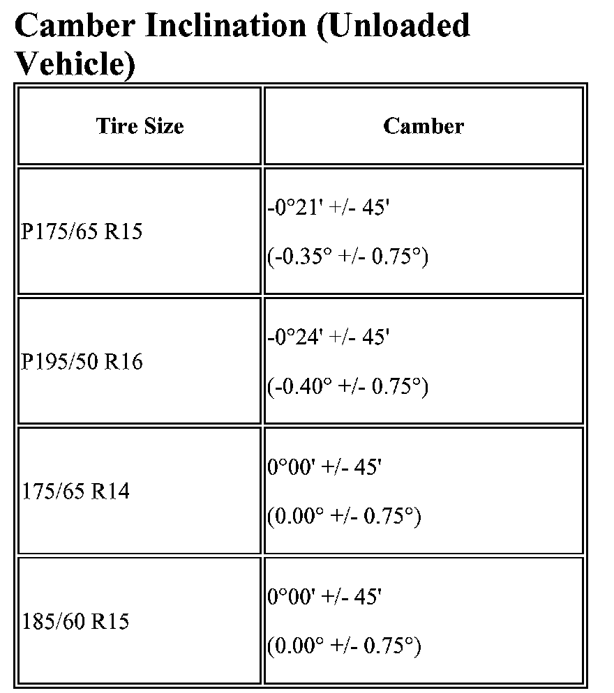 - The tolerance for the difference between the left and right wheels is 30° (0.5°) or less for both the camber and caster.