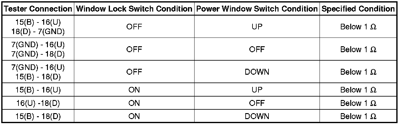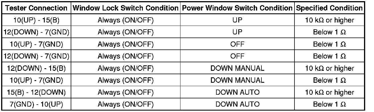 If the result is not as specified, replace the power window regulator master switch assembly.