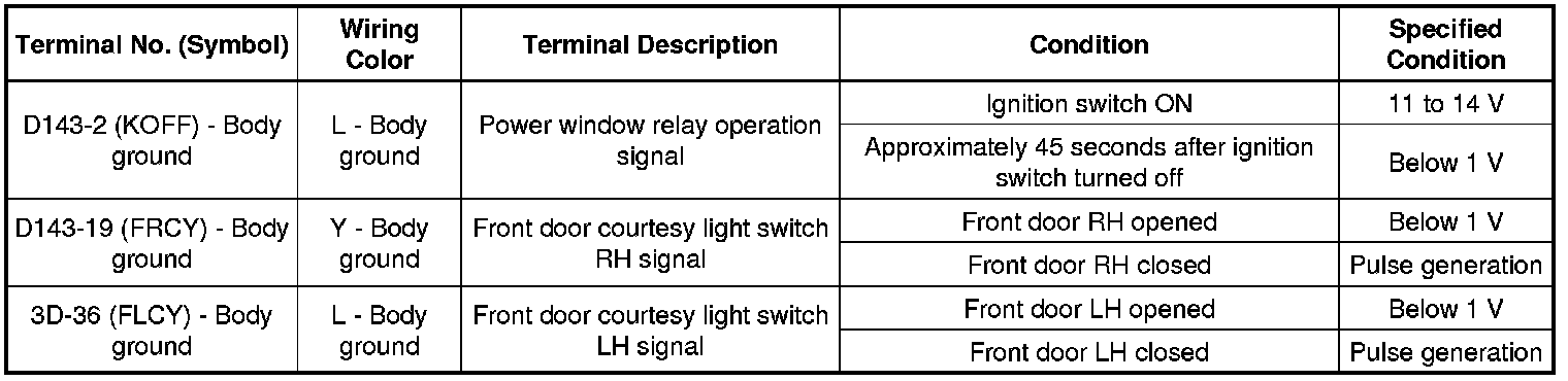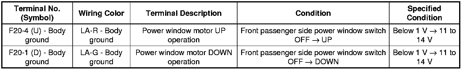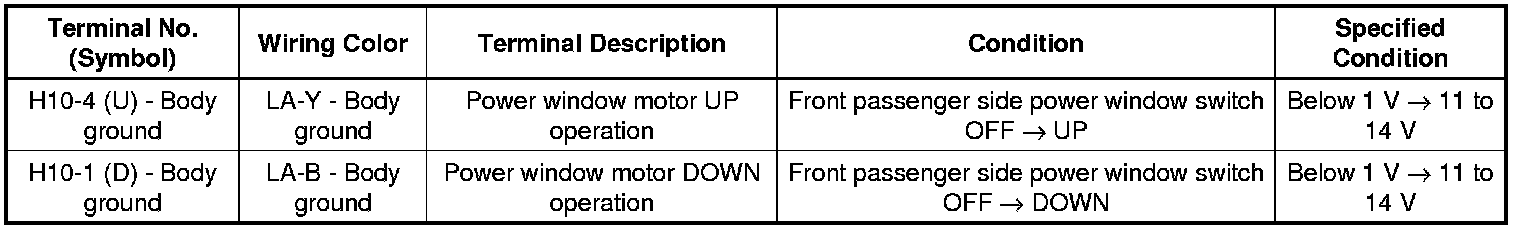 If the result is not as specified, the power window regulator switch assembly (front passenger side) may have a malfunction.