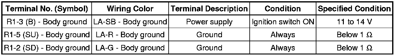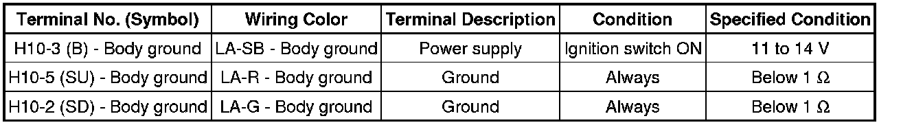 If the result is not as specified, the power window regulator master switch assembly may have a malfunction.