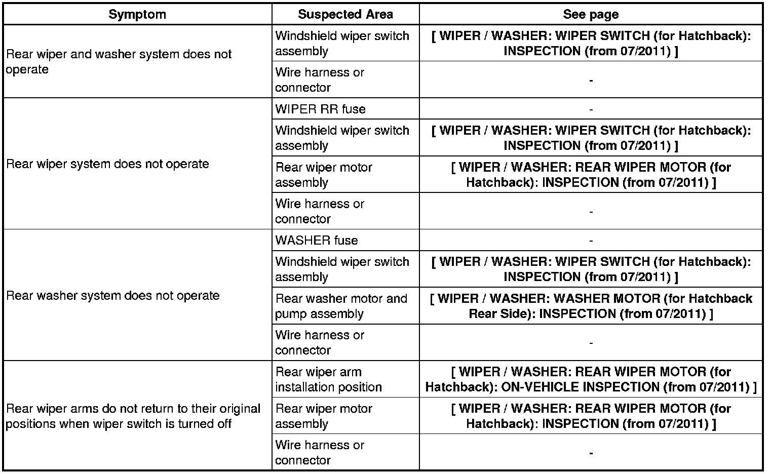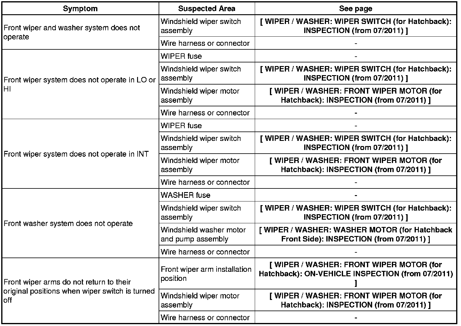 WIPER / WASHER: WIPER AND WASHER SYSTEM (for Hatchback): PROBLEM SYMPTOMS TABLE