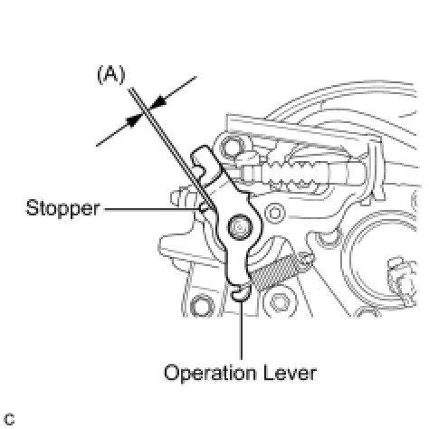 (a) Release the parking brake lever and check that the clearance measurement between the rear disc brake cylinder operation lever and the stopper is within the specified range.