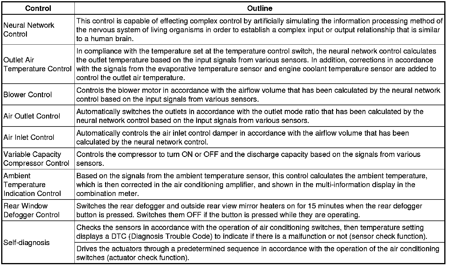 However, because the senses of a person are rather complex, a given temperature is sensed differently, depending on the environment in which the person is situated. For example, a given amount of solar radiation can feel comfortably warm in a cold climate, or extremely uncomfortable in a hot climate. Therefore, as a technique for effecting a higher level of control, a neural network has been adopted in the automatic air conditioning system. With this technique, the data that has been collected under varying environmental conditions is stored in the A/C amplifier. The A/C amplifier can then effect control to provide enhanced air conditioning comfort.
