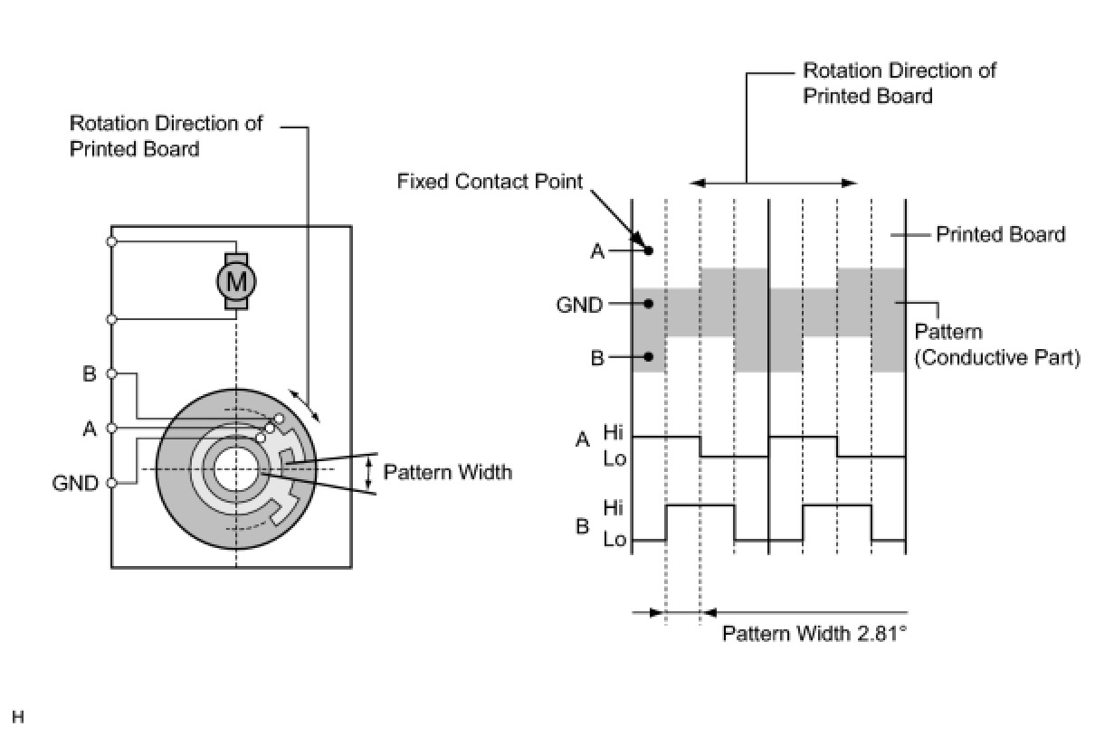 The forward and reverse revolutions of this motor are detected by way of two phases, A and B, which output four types of patterns. The air conditioning amplifier counts the number of pulse patterns in order to determine the stopped position.