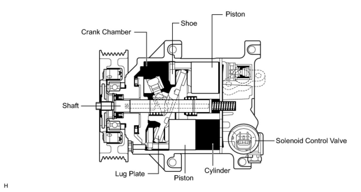(2) The compressor consists of the shaft, lug plate, piston, shoe, crank chamber, cylinder, and solenoid control valve.