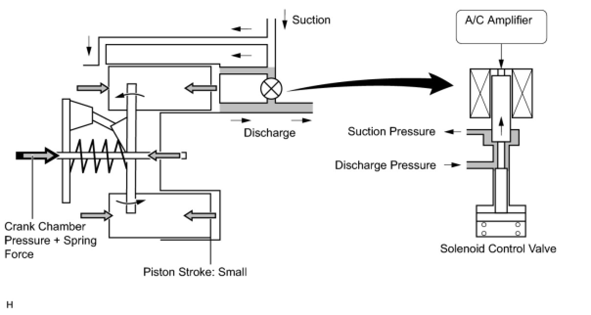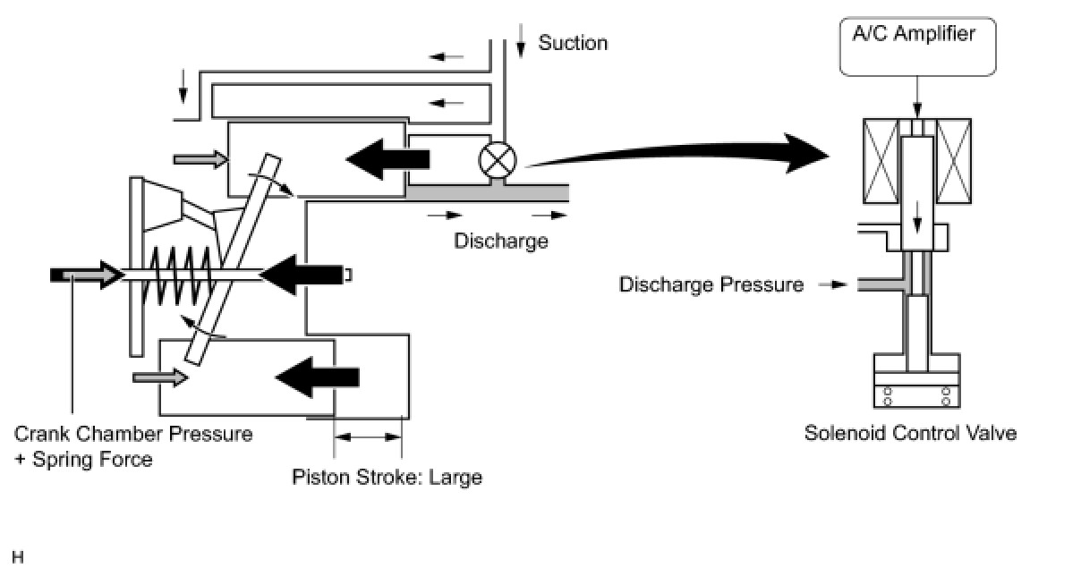 (4) When the solenoid control valve opens (solenoid coil is not energized), the difference in pressure disappears. Then, the pressure that is applied to the left side of the piston becomes the same as the pressure that is applied to the right side of the piston. Thus, the spring elongates and eliminates the tilt of the lug plate. As a result, there is a small piston stroke and the discharge capacity decreases.