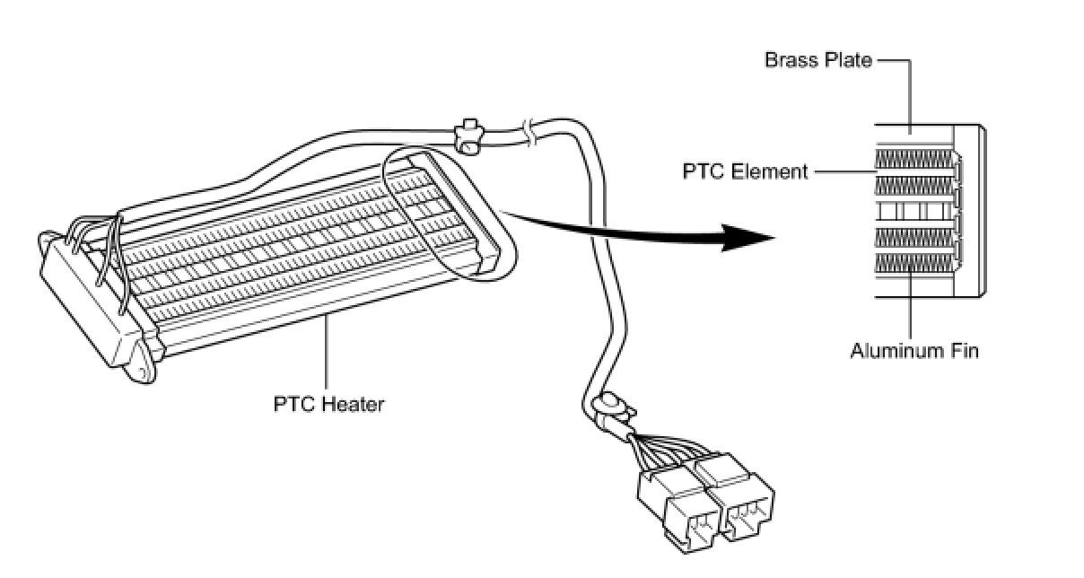 (2) The PTC heater consists of a PTC element, aluminum fin, and brass plate. When current is applied to the PTC element, it generates heat to warm the air that passes through the unit.