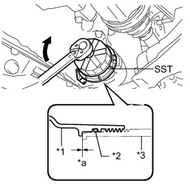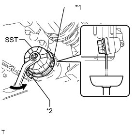 (a) Using SST, loosen the oil filter cap 4 revolutions, align the cap ribs vertically, and drain the remaining engine oil in the oil filter cap.
