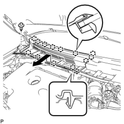 (a) Disengage the clip and 14 claws, and remove the center No. 1 cowl top ventilator louver.
