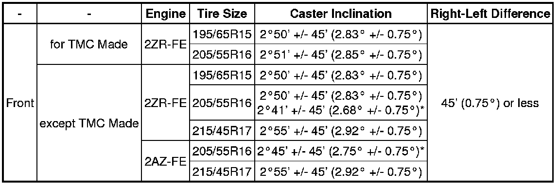 SPECIFICATIONS: ALIGNMENT / HANDLING DIAGNOSIS: SERVICE DATA; 2013 MY Corolla [07/2012 -]