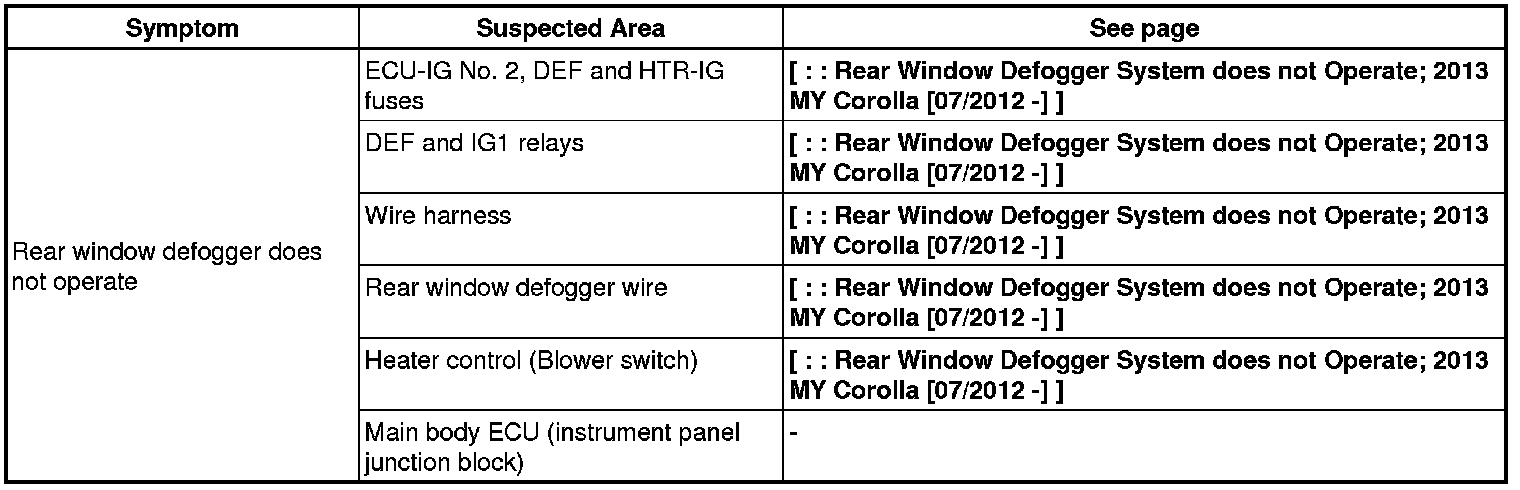 WINDOW / GLASS: WINDOW DEFOGGER SYSTEM (for Manual Air Conditioning System): PROBLEM SYMPTOMS TABLE; 2013 MY Corolla [07/2012 -]
